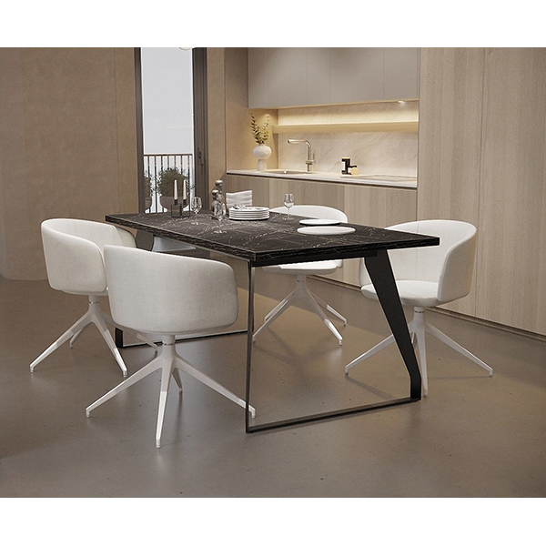 Její zkosené provedení s různou šířkou profilu vytváří skutečně nevšední jídelní stůl a s možností osazení deskou z libovolného materiálu můžete mít stůl přesně dle svého vkusu.