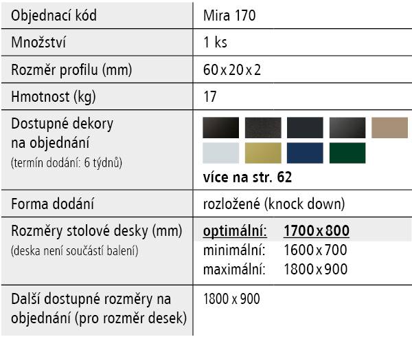 - Optimální rozměr stolové desky 1700 x 800 x 36 mm