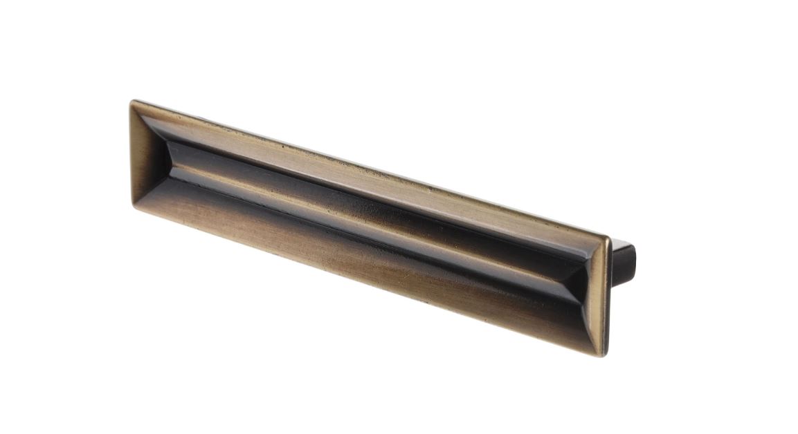 Rustikální úchytka Hilda z lesklého bronzu dotváří postarší vzhled nábytku.