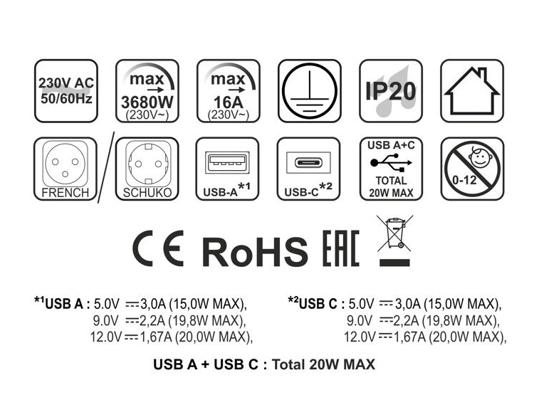 Zásuvka je vybavena 2x 230V a 2x USB A/C včetně 1,2 m napájecího kabelu s hloubkou 65 mm.