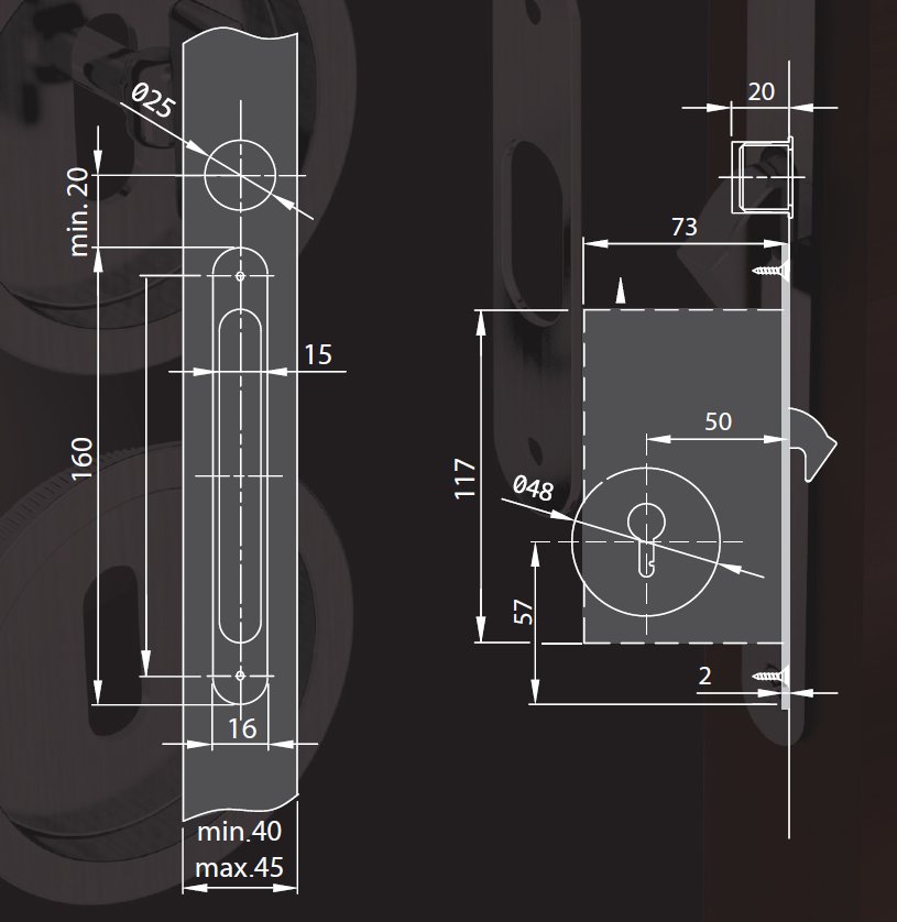 - v kombinaci zámků s mušlemi lze použít pro dveře o síle od 40 do 45 mm